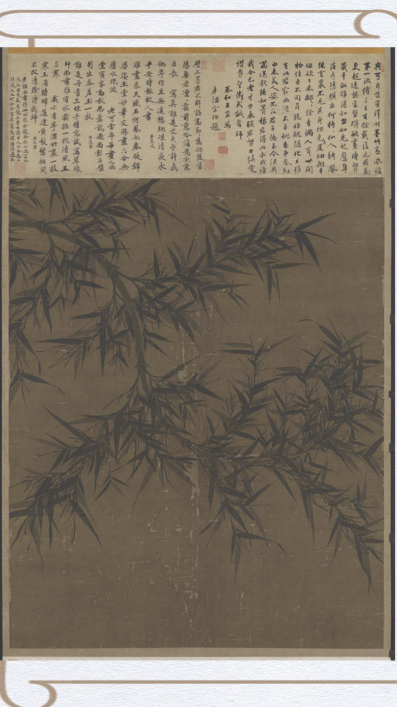 【渭川千亩贮胸中,烟雨都归笔锋里】 当我们展开文同(字与可)的《墨竹图》,总会想起苏轼在《文与可画笕笃谷偃竹记》中对表兄文同的深情回忆。北宋元丰二年七月,苏轼于湖州曝晒书画,忽见文同遗作《篔笃谷偃竹图》,一时悲恸不已,“废卷而哭失声”。其后所作长文,似戏语而实藏深悲。在悲凉深处,正有一缕竹影轻轻摇曳。 一直以来,猗猗绿竹是中国文人笔墨与心灵间不可割舍的精神意象。文同笔下这一枝倒垂竹姿,可谓尽摄