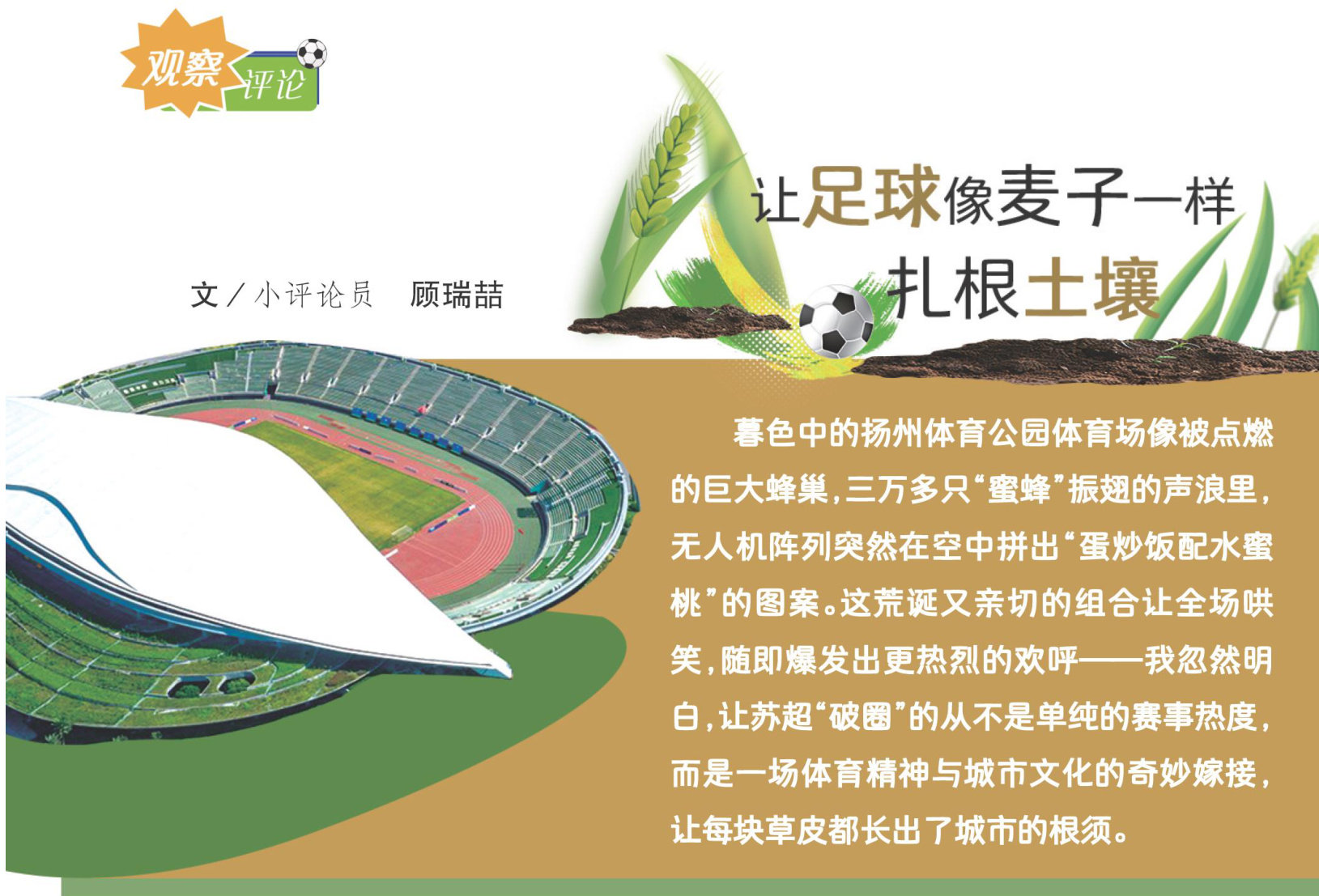 当初夏的风拂过瘦西湖的烟柳,当大运河的清波映照绿茵场的霞光,一场关于体育精神与地域文化的共鸣,正在江苏大地上热烈传响。“苏超”(江苏省城市足球联赛)的到来,恰似一滴露珠落人古运河的波澜,激起的不仅是赛场的欢呼,更是千年文脉与当代活力的深度交融。 苏超”之美,在于它让体育超越了竞技的范畴,成为地域文化的鲜活注脚。正如扬州与泰州的“早茶德比”,蒸笼里升腾的不只是三丁包的香气,更是千年漕运滋养出的