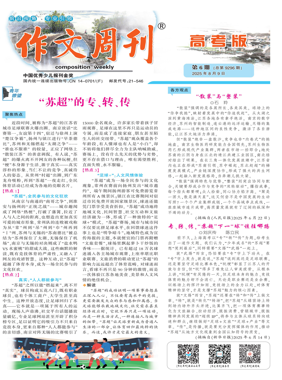 聚焦热点 近段时间,被称为“苏超”的江苏省城市足球联赛火爆出圈。南京放话“比赛第一,友谊第十四”,宿迁与徐州上演“楚汉争霸”,扬州与镇江进行“早茶德比”,苏州和无锡燃起“太湖之争”……“谁也不服谁”的较量,正应了网络上“散装江苏”的善意调侃。有人说,“苏超”的爆火离不开网友的各种玩梗,但“梗”本身源于生活,源于真实——真实淳朴的形象、当仁不让的竞争、真诚待人的姿态。从贵州“村超”出圈,到广东龙