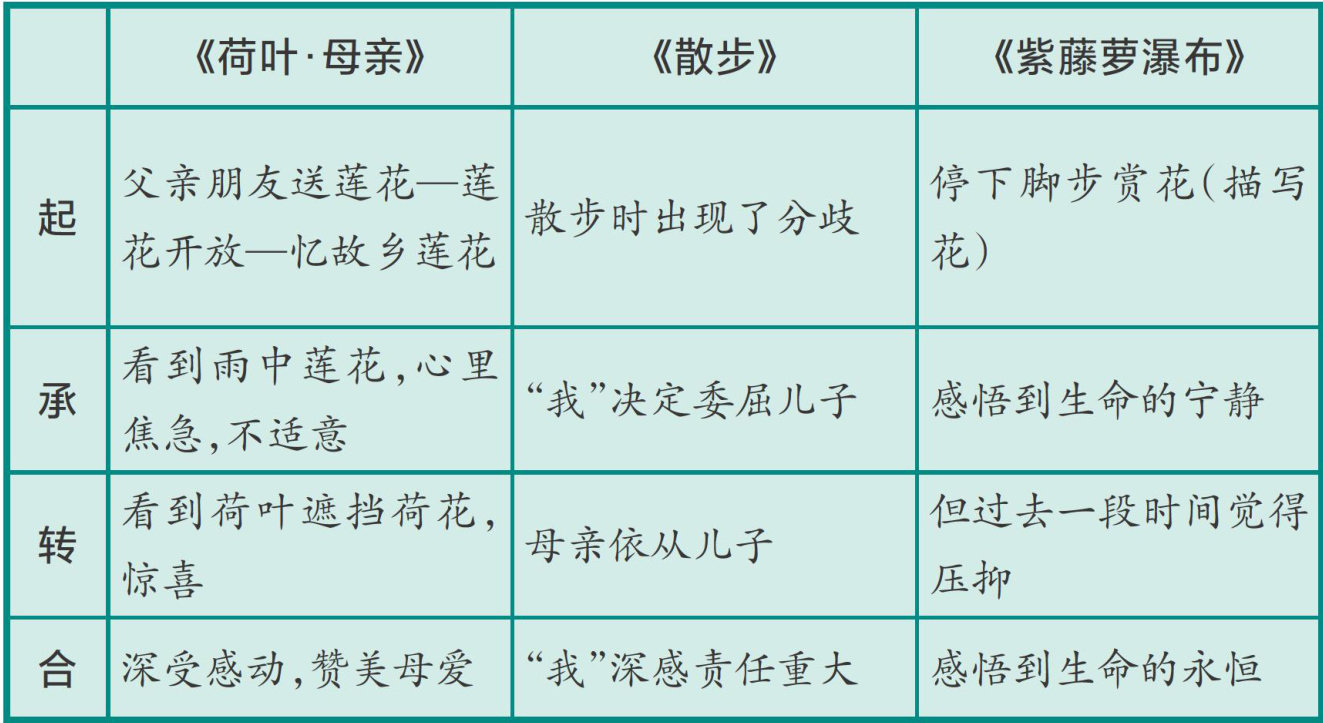 知识场 1.总分总(总分、分总)的结构有什么好处? 使得写作思路与文章结构非常清晰,能让读者比较快速地把握文章主旨。尤其是总分总的结构,前后照应,结构完整,往往能使文章主旨更明确。 2.除了总起全文或总结全文,一个句子在结构上还能起到哪些作用?充当线索、承上启下、与文中的某个句子形成照应等。 方法场 我们能从课文中学习哪些文章结构呢? 一、总分总类(总分、分总) 写作时采用总分总类的