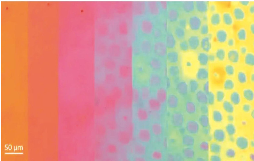 图1皮肤样品中颜色、图案演变过程的延时摄影(图/斯坦福大学) 自然界中,章鱼、乌贼等头足类动物通过控制皮肤中的色素细胞和肌肉组织,可在毫秒级时间内改变体色与纹理,实现与周围环境的完美融合。这种生物伪装机制涉及复杂的神经调控,人工材料想要同时实现颜色与纹理的可逆调控,一直是道难题。 美国斯坦福大学的研究人员开发出一种可编程薄膜,能实现纹理与色彩的动态转换。该技术有望应用于伪装、柔性机器人等技