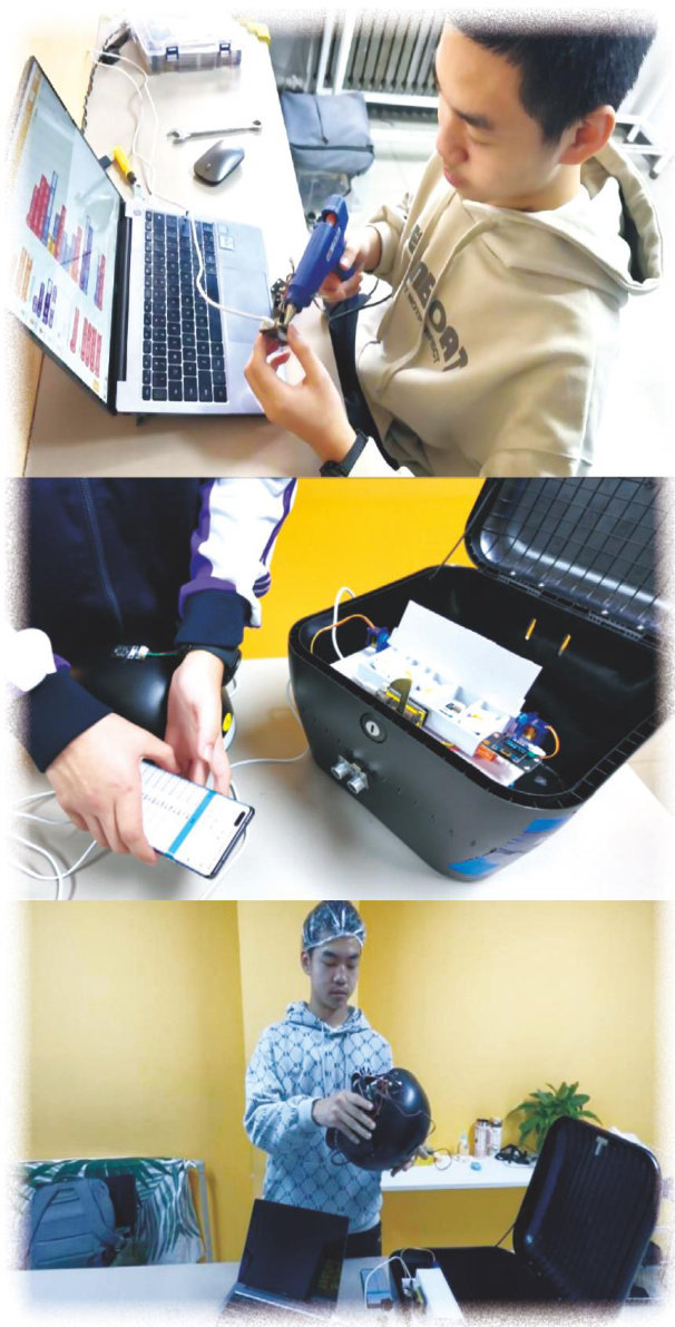 图1制作过程及使用演示 一天,妈妈想骑一辆共享电动单车,但望着车筐里沾满灰尘的头盔,她无奈地对我说道:“你看这头盔内衬,沾满雨水和污渍但不佩戴随车配备的共享头盔,又无法骑车,真是两难。” 妈妈的话勾起了我的兴趣,我开始认真观察街头常见的共享电动单车。我发现很多时候,车筐内的头盔直接暴露在外,甚至被人塞进广告单、垃圾等,卫生状况令人担忧。因此,很多人宁愿冒险“作弊”一比如用纸巾遮住传感器或将