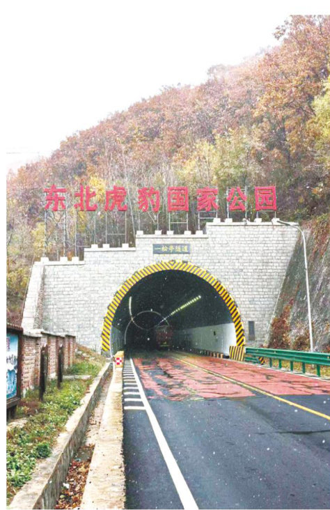 图1穿过一松亭隧道就进入了东北虎豹国家公园 沿331国道离开吉林省珲春市区往东行驶,大约20千米后便见一松亭隧道,隧道口上方8个鲜红的大字告诉我们,这里便是“东北虎豹国家公园”。此时正值深秋,道旁林海如金色浪潮从车窗闪过,令人心潮澎湃。我有幸与东北虎研究专家冯利民教授团队一道,深入公园腹地开展野外考察。 东北虎豹国家公园地处长白山支脉老爷岭南部区域,总面积1.41万平方千米,是我国首批设立