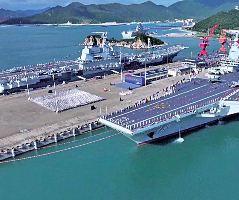 福建舰(更多内容详见《知识就是力量》杂志2022年8月刊) 中国海军正式开启三航母时代 2025年11月5日,我国第一艘电磁弹射型航空母舰福建舰入列授旗仪式在海南三亚举行。随着福建舰入列,中国海军正式进入三航母时代。 福建舰是我国第一艘电磁弹射型航空母舰,也是我国第三艘航空母舰,舷号为18,2022年6月下水命名。福建舰由我国完全自主设计建造,其电磁弹射技术处于世界先进水平,是全球首艘常规动
